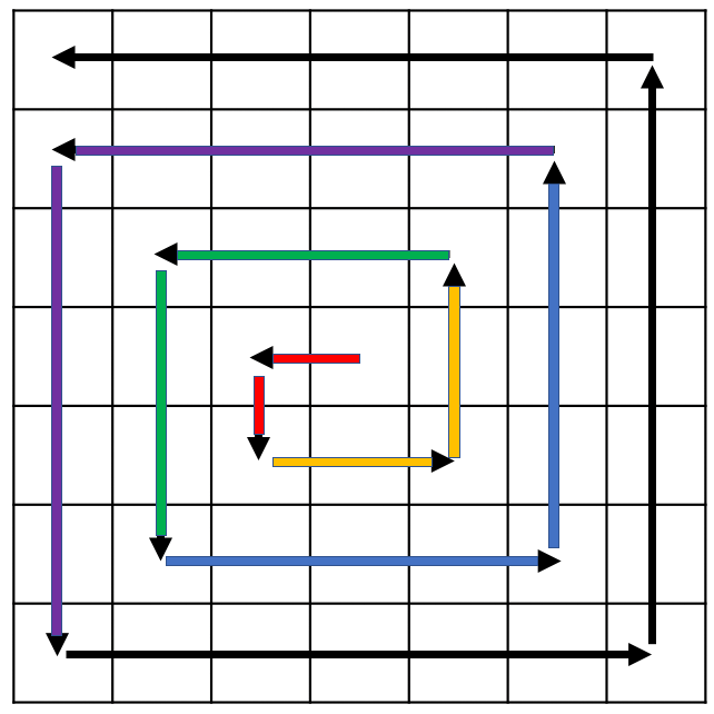 위치가 바뀌는 방향의 순서가 ← , ↓ , → , ↑ 이고 방향이 2번 바뀔때마다 이동하는 칸이 1씩 증가하는 규칙을 이용했습니다.
