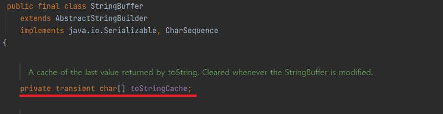 String과 다른점은 불변이 아니라 동적이라는 것인데 내부에 char형 배열을 가지고 있다.
