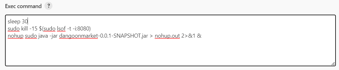 Exec command 에서는 무중단 배포가 이루어 지도록 하기 위해서, 기존의 스크립트에 sleep 30을 추가해 주자.
