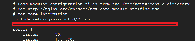 그다음 스크롤을 내려 include와 server사이에 (아래 그림의 빨간 사각형 위치) upstream 변수를 추가해 주어야 한다.